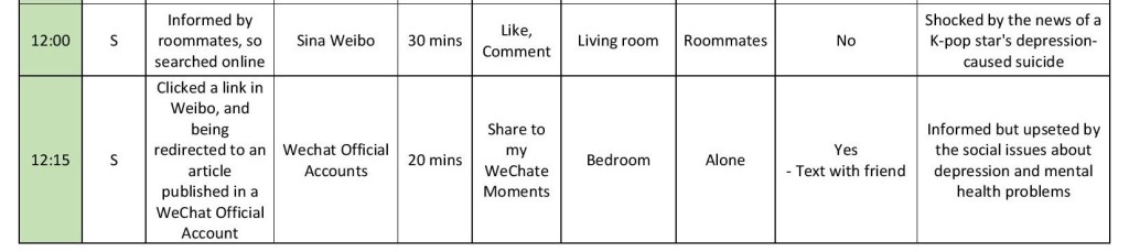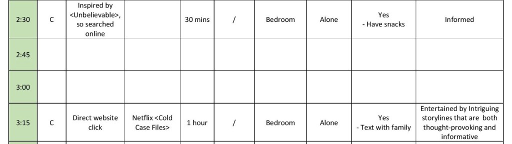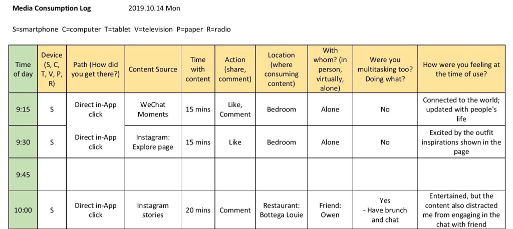 Illustrated by the log, social media dominates my media consumption inarguably: my interaction with a new day initiated by scrolling down the WeChat Moments, in which those in my circle of intimates post their up-to-date activities and thoughts. In this case, social media enables me to vicariously experience a slice of my beloved ones’ lives, allowing the engagement and involvement transcending the spatial and time boundaries. Whereas it’s the vital portion of my daily social connection, social media’s disruptive nature unmasked when it distracted me from fully engaging in the brunch chat with a friend, indicating that the parasocial relationship within webspace could potentially impair the effectiveness of real-life, in-person interactions.